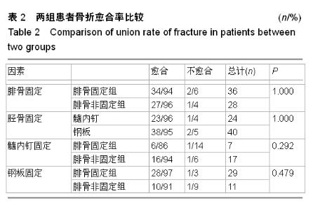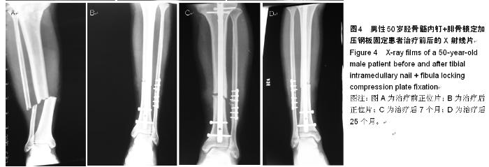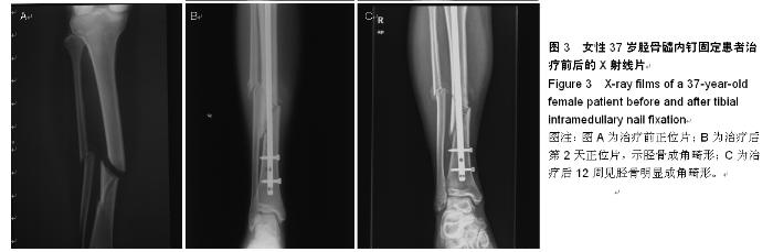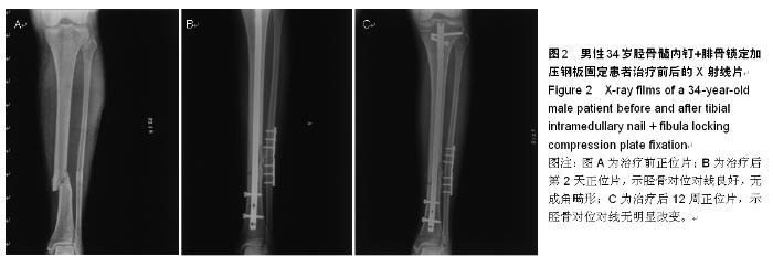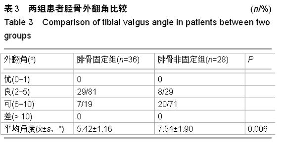 RESULTS AND CONCLUSION: No significant difference in union rate of fracture, bone union time and ankle range of motion was detected between two groups. Tibial valgus angle was smaller in the fibula fixation group (5.42±1.16)° than in the fibula non-fixation group (7.54±1.90)°(P=0.006). Ankle function score was higher in the fibula fixation group (93.58±0.97) than in the fibula non-fixation group (90.57±3.92) (P=0.000). Three cases in the fibula fixation group suffered from superficial wound infection, and achieved good healing after treatment of  anti-infection and changing dresses. Above results verify that fibular fixation can reduce tibial valgus angle and improve ankle joint function in treatment of distal third tibia fractures.
