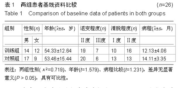 METHODS: (1) We used a prospective randomized controlled design. The 52 patients with I° or II° degenerative lumbar spondylolisthesis were randomly divided into two groups, with 26 cases in each group. Conventional exercises were carried out in the control group and core stabilization exercises for the treatment group, with course of treatment for 24 weeks. Curative effects of numerical rating scale and the Oswestry Disability Index were compared at 6, 12 and 24 weeks after treatment respectively. (2) Spinal stability after lumbar fusion and fixation of the implant for degenerative lumbar spondylolisthesis was evaluated by database document retrieval.