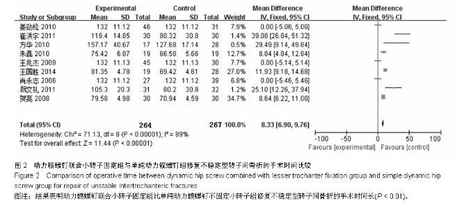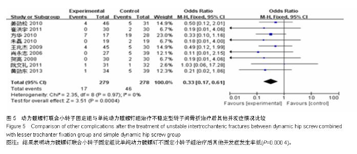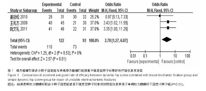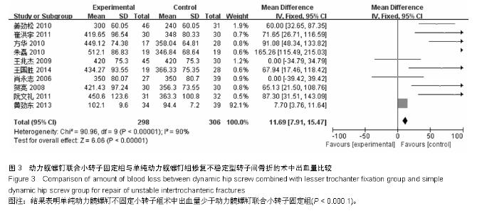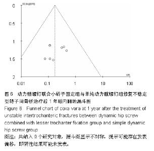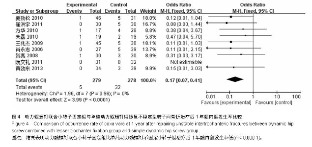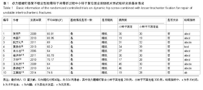 RESULTS AND CONCLUSION: A total of 10 randomized controlled trials involving 604 patients were included. Among them, 298 cases were assigned to the dynamic hip screw combined with lesser trochanter fixation group, and 306 cases to the lesser trochanter unfixed group. The meta-analysis results indicated that hip coxa vara, other postoperative complications, the excellent and good rate of efficacy in the dynamic hip screw combined with lesser trochanter fixation group were all superior to those in the lesser trochanter unfixed group (all P < 0.000 1), and for hip coxa vara, the parameters were odds ratio=0.17, 95% confidence interval (0.07, 0.41), Z=3.99, P < 0.000 1. The operation time and the amount of blood loss in the lesser trochanter unfixed group were superior to those in the dynamic hip screw combined with lesser trochanter fixation group (all P < 0.000 1). These results suggest that the lesser trochanter unfixed therapy has the advantages of relatively simple operation, shorter operative time and less blood loss during the process of dynamic hip screw internal fixation for repair of unstable intertrochanteric fractures. However, the excellent and good rates of efficacy, hip coxa vara and other postoperative complications were superior in patients with intertrochanteric fracture above the Tronzo-Evans III type who received dynamic hip screw combined with lesser trochanter fixation to those who received lesser trochanter unfixed therapy. The results indicate that dynamic hip screw combined with lesser trochanter fixation for repair of intertrochanteric fracture is beneficial to prevent hip coxa vara and other complications.
