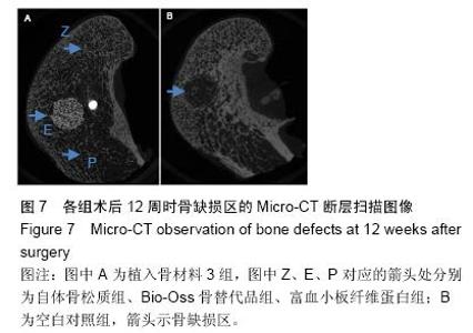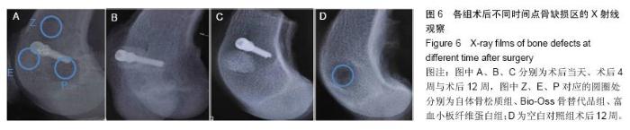 METHODS: Four areas of cylindrical critical bone defects with a diameter of 6.0 mm and depth of 10.0 mm were prepared in the medial femoral condyle of beagle dogs. Three areas of bone defects were implanted with autologous platelet-rich fibrin, Bio-Oss bone substitutes and autologous cancellous bone, respectively. The remaining one area of bone defect was not implanted any substance, as control group. X-ray and Micro-CT detections in bone defect area were conducted after 12 weeks of surgery.