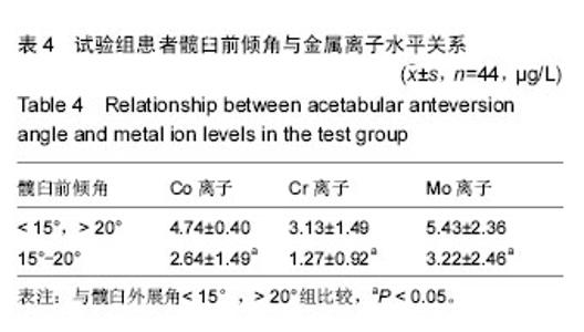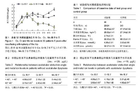 METHODS: We included 32 patients undergoing RSAH (40 hips) and 12 patients undergoing M-M THR (14 hips). Average metal ion value of six normal people was considered as normal reference value. Prosthesis position was measured by using X-ray and CT after replacement. ICP-MS could accurately determine serum metal ion levels in patients after hip arthroplasty.