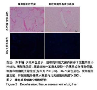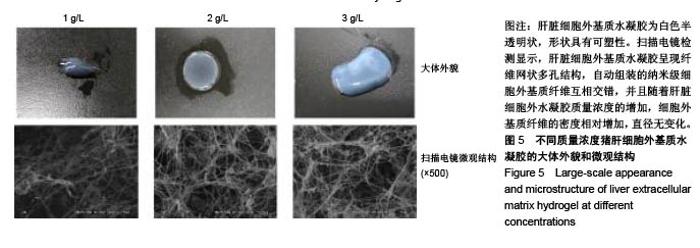 RESULTS AND CONCLUSION: (1) The decellularized liver scaffold was obtained by mild decellularization technique, and the decellularization was complete. (2) The DNA content of the decellularized liver scaffold was significantly lower than that of normal liver tissue (P < 0.001). (3) The liver matrix hydrogel precursor solution retained many components of the pig liver extracellular matrix, such as collagen, elastin, glycan and its precursors. (4) The turbidity kinetics experiment showed that the absorbance value of the plateau increased with the increase of the mass concentration of the liver matrix gel. (5) Scanning electron microscope showed that the liver matrix hydrogel possessed a fibrous network porous structure, and the nano-scale extracellular matrix fibers were interlaced with each other. As the mass concentration of the liver matrix hydrogel increased, the fiber density increased relatively and the diameter revealed no change. (6) These results indicate that the liver matrix hydrogel is prepared by gentle decellularization technique and exhibits a three-dimensional network structure, which provides a structural basis for cell adhesion and growth.
