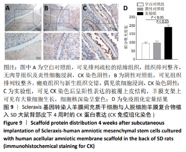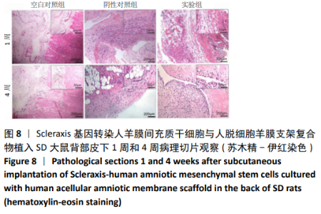 2.8 Scleraxis基因转染人羊膜间充质干细胞与人脱细胞羊膜支架复合物植入大鼠体内的免疫原性 细胞支架复合物移植入SD大鼠背部皮下1周和4周时收集样本行苏木精-伊红染色,4周时收集样本行CK免疫组织化学染色。 苏木精-伊红染色:①空白对照组:1周和4周时筋膜层组织可见排列疏松的脂肪层与脂肪层下方整齐排列的横纹肌,无肉芽组织及炎性细胞浸润。②阴性对照组:1周时皮下组织结构紊乱,层次表现不明显,大量中性粒细胞将组织包绕,基底层偶见浆细胞,局部炎症较为典型;4周时可见术区大量空泡状脂肪细胞及疏松结缔组织,肉芽组织及新生血管减少,偶见中性粒细胞、浆细胞,炎症反应减退。③实验组:1周时相较于阴性对照组炎症反应更为明显,肉芽组织及纤维组织增生,可见术区肌肉萎缩,炎性细胞浸润;4周时炎性细胞明显减少,组织排列趋于整齐,可见淡粉色的被覆上皮组织,高度认为是人脱细胞羊膜结构,其表面可见大量细胞附着生长。见图8。"