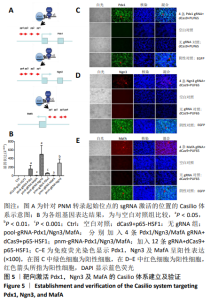 2.1 靶向激活Pdx1,Ngn3及MafA的Casilio体系建立及验证 应用qPCR和免疫荧光检测PNM在293T细胞系中的表达水平,以验证Casilio体系对细胞系内源基因的激活作用。结果显示,与Ctrl组以及No gRNA组相比,分别加入针对Pdx1,Ngn3及MafA的4条gRNA组的基因水平分别上调163倍(P=0.023 2), 503倍(P=0.013 7)和 12倍(P=0.000 2)。同时加入针对PNM的12条gRNA组,Pdx1基因表达水平上调 62倍(P=0.000 2), Ngn3基因表达水平上调301倍(P=0.004 6), MafA基因表达水平上调12倍(P=0.010 8),当加入的gRNA达到12条后,与只加了4 gRNAs组相比基因表达无明显差异(P=0.196 0),见图5A,B。通过免疫荧光检测到了内源PNM蛋白的表达,见图5C-E所示,表明Casilio体系可以实现内源基因的靶向激活。"