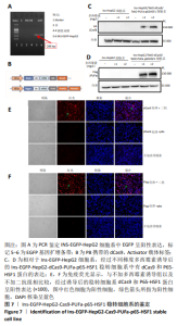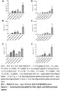 2.2 筛选针对Pdx1,Ngn3,MafA启动子区域的最佳gRNA 为了筛选Casilio体系中激活作用最佳的gRNA,将dCas9、PUFa-P65-HSF1表达质粒与分别针对Pdx1,Ngn3及MafA启动子区域的4条gRNA的表达质粒按照1∶1∶1的比例单独或联合转染293T和HepG2细胞。如图6所示,在293T细胞系中Pdx1基因的gRNA3上调26倍 (P < 0.000 1),gRNA2上调16倍(P < 0.000 1),在4条gRNA中上调倍数最高;针对Ngn3基因的gRNA3和gRNA2上调倍数最高,分别上调501倍(P=0.000 8)和398倍(P=0.001 0);MafA基因gRNA2和gRNA4上调倍数最高,分别上调3倍和2倍。在HepG2细胞系中针对Pdx1基因的gRNA4和 gRNA3上调倍数最高,分别上调223倍(P=0.000 4)和82倍(P=0.000 3);针对Ngn3基因的gRNA3和 gRNA2上调倍数最高,分别上调 234倍(P=0.000 1) 和95倍(P=0.001 1)。针对MafA基因的gRNA2和gRNA4上调倍数最高,分别上调6倍和5倍。针对Pdx1,Ngn3和MafA基因的4条gRNA在293T和HepG2细胞中均有协同效应,即4条gRNA同时转染的激活效率高于单个gRNA转染。 2.3 Ins-EGFP-HepG2-dCas9-PUFa-p65-HSF1稳转细胞系的构建及鉴定 为了验证PNM的重编程效率,利用慢病毒构建针对Insulin基因启动子的绿色荧光报告基因(EGFP)细胞系,用以标记胰岛素基因表达阳性的细胞,见图7A,结果显示EGFP报告基因插入稳转细胞系基因组中。由于dCas9及PUFa-p65-HSF1序列较长,质粒的表达效率低,因此,利用PB转座子体系在Ins-EGFP-HepG2细胞系的基础上,构建了稳定表达dCas9和PUFa-P65-HSF1的Ins-EGFP-HepG2-dCas9-PUFa-p65-HSF1稳转细胞系,PB携带的dCas9和Activator载体标签,见图7B。免疫印迹和免疫荧光结果均显示,经过筛选及多西环素诱导后的稳转细胞系中有dCas9和P65-HSF1蛋白的表达,见图7C-F,表明PB转座子成功实现了dCas9,P65-HSF1片段在HepG2肝细胞系基因组的整合,并且稳转细胞系构建过程中未见细胞形态的明显改变。稳定表达dCas9和PUFa-p65-HSF1蛋白的稳转细胞系只需导入gRNA即可实现内源基因激活作用。"