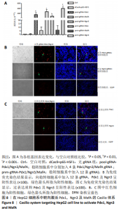 2.4 Casilio体系将肝脏细胞系HepG2重编程为胰岛样细胞 向稳转细胞系中分别导入针对Pdx1,Ngn3及MafA启动子的4条gRNA,qPCR检测内源基因的相对表达水平,结果显示Pdx1基因上调156倍(P=0.014),Ngn3基因上调275倍(P=0.001),MafA基因上调6倍。同时导入针对3个基因的12条gRNA后,Pdx1基因表达上调93倍(P=0.004 6),Ngn3基因表达上调 404倍(P=0.000 3),MafA基因表达上调7倍,见图8A,说明Cailio体系可以高效靶向激活PNM。免疫荧光结果显示,相对于Pdx1及Ngn3过表达质粒,见图8C,Casilio体系可以实现Pdx1及Ngn3蛋白的明显表达,进一步证实了Casilio体系激活内源基因的作用,见图8B。"
