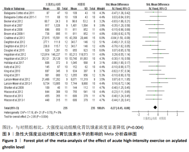 Abstract: OBJECTIVE: Acute high-intensity exercise can temporarily suppress appetite, but the effect of appetite hormones in this process is inconclusive. Meta-analysis is used to explore the effects of acute high-intensity exercise on adult appetite hormones, and provide theoretical basis for the follow-up research on the effects of exercise on appetite hormones.