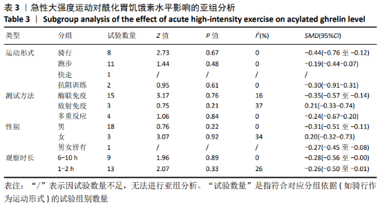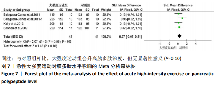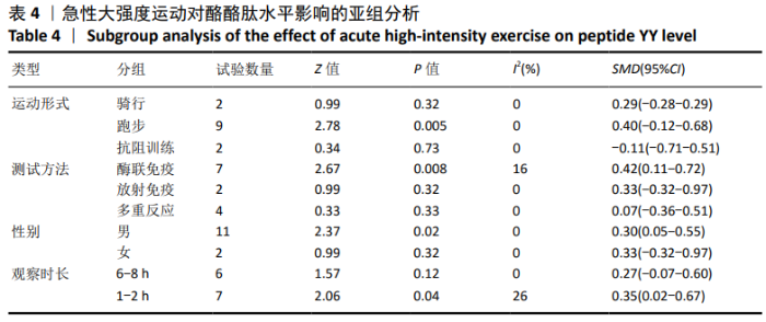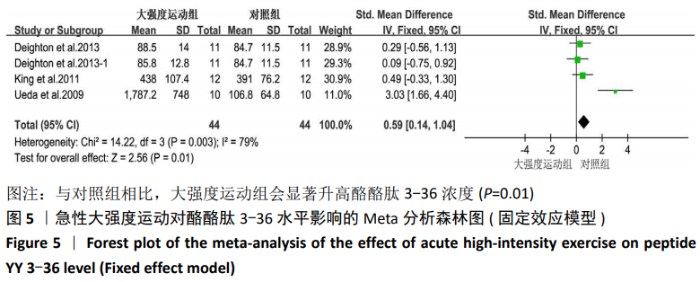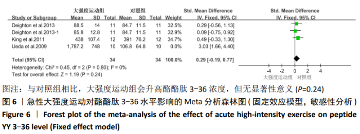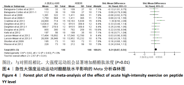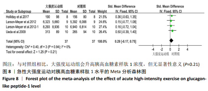 RESULTS: A total of 18 research literatures were included, with a total of 212 subjects, including 179 males and 33 females. The literature quality evaluation results showed that the overall literature quality was high. Meta-analysis results showed that acute high-intensity exercise could significantly inhibit acylated ghrelin level (standardized mean difference (SMD)=-0.27, 95% confidence interval (CI):-0.45 to -0.08, P < 0.05), and significantly increase peptide YY (SMD=-0.31, 95%CI: 0.07-0.54, P < 0.05). Although there was an increase in the levels of peptide YY 3-36 (SMD=0.29, 95%CI: -0.19 to 0.77, P ﹥ 0.05), pancreatic polypeptide (SMD=0.37, 95%CI: -0.07 to 0.81, P ﹥ 0.05), and glucagon-like peptide-1 (SMD=0.29, 95%CI: -0.17 to 0.75, P ﹥ 0.05) after acute high-intensity exercise, it had no significant significance.