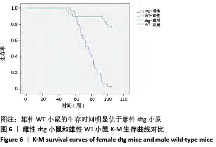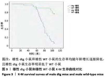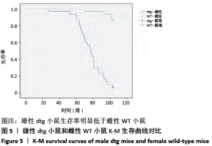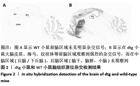 RESULTS AND CONCLUSION: Agarose gel electrophoresis results showed the molecular weight of the PCR products of dtg mice was consistent with the expected target gene fragment. In situ hybridization results showed a strong signal of CCKR-2 was detected in the forebrain of dtg mice, but hardly present in the WT mice. The median survival time of dtg mice was 76 weeks in females and 77 weeks in males. The survival probability was decreased with age in dtg mice. The survival probability of WT mice was significantly better than that of dtg mice (P < 0.001). There was no significant sex difference between males and females of dtg mice (P=0.577). Therefore, the specific expression of CCKR-2 transgene in the forebrain can be identified using PCR amplification, genomic DNA extraction, agarose gel electrophoresis, and in situ hybridization. tTA/tetO-CCKR-2 double transgenic induction may shorten the survival time of mice, but no significant difference is observed between the females and males of dtg mice.