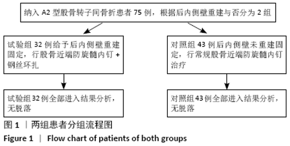 METHODS: The medical records of 75 patients with type A2 intertrochanteric fractures who were treated with proximal femoral nail antirotation in Third Affiliated Hospital of Anhui Medical University from March 2016 to March 2020 were retrospectively analyzed. Patients undergoing posteromedial wall and fixation served as trial group (n=32) and those without reconstruction as control group (n=43). After long-term follow-up, the Harris function score, fracture healing time, full weight bearing time, and adverse events of the two groups were compared.