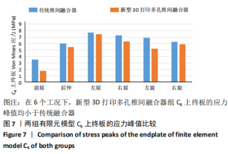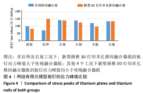 RESULTS AND CONCLUSION: (1) Combined with the 3D finite element analysis, we found that the peak values of vertebral displacement and the peak values of Von-Mises stress on fusion cage, upper and lower end plates were significantly lower in the new cervical 3D printed porous fusion cage group than those of the traditional cage group under the six conditions of forward bending, back stretching, left and right side bending and left and right rotation. (2) As for titanium plates and titanium nails, except under the two working conditions of posterior extension and right rotation, the peak value in the new cervical 3D printed porous fusion cage group was larger than in the traditional cage group. Under the other four working conditions, stress peak values were smaller in the new cervical 3D printed porous fusion cage group than in the traditional cage group. (3) Therefore, compared with the traditional fusion cage, the application of the new 3D printed porous intervertebral fusion cage can avoid the stress concentration of upper and lower endplates, improve the stability of fixed segments, and reduce the sinking risk of internal plants to a certain extent.