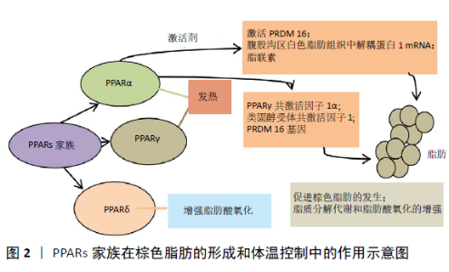 2.1 PPARs-BAT-肥胖轴在小鼠代谢调节中的作用 2.1.1 BAT与肥胖 肥胖是导致代谢紊乱的危险因素之一,可导致高血压、胆固醇和三酰甘油升高、胰岛素抵抗和糖尿病。肥胖的特征是通过脂肪细胞增生(脂肪细胞数量增加)和脂肪细胞肥大(脂肪细胞体积增大)以及脂肪组织功能障碍而发生的脂肪量膨胀[1]。长期摄入超过维持需求所需的能量会导致体内脂肪堆积,最终导致肥胖[2]。脂肪组织是控制能量消耗、食欲、胰岛素敏感性、内分泌、生殖功能、炎症和免疫等重要代谢途径的复杂而活跃的器官[3]。其中BAT是一种通过解偶联热形成来燃烧能量的器官[4],它的生热能力与线粒体解偶联蛋白1(uncoupling protein 1,UCP1)有关[5]。棕色脂肪细胞内含有大量线粒体和分散的脂质,通过UCP1产生热量[1]。BAT同时也是一种有效的三酰甘油血症调节剂,被认为是啮齿类动物血浆中主要的脂类清除器官[3]。研究人员估计,每天只有56.698 g(两盎司)的BAT可以燃烧高达2.093 kJ的热量,这意味着在治疗肥胖和相关疾病方面有巨大的治疗潜力[6]。 2.1.2 BAT与PPARs 研究发现,PPARs可通过调节合成代谢和氧化过程之间的平衡来调节脂肪组织的动态平衡,在肥胖的调节中发挥着重要的调节作用[7]。PPARs家族在棕色脂肪的形成和体温控制中起着核心的作用,迄今已鉴定出3种PPARs亚型,分别是PPARα、PPARγ和PPARδ。PPARα和PPARγ与热发生直接相关,PPARδ具有增加脂肪酸氧化的能力[8]。PPARα与PPARγ共激活因子1α(PGC-1α)、类固醇受体共激活因子1(SRC-1)和PRDM 16基因(激活BAT关键特征的基因)共同促进棕色脂肪的发生:当PPARα被相应激动剂激活时,直接激活PRDM 16、腹股沟区白色脂肪组织中UCP-1 mRNA及脂联素的表达,促进脂肪的褐变,同时伴随着脂质分解代谢和脂肪酸氧化的增强[9](图2)。当PPARα基因缺失时,β3肾上腺素能受体激动剂诱导的脂肪组织褐变减弱[10]。 "