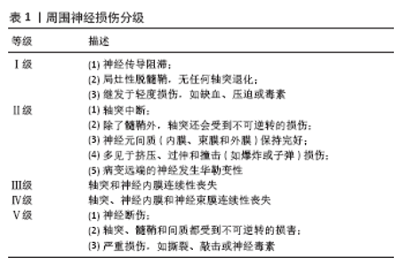 2.1 周围神经损伤简介 流行病学研究表明,周围神经损伤的发生率可高达所有创伤患者的3%[1-2]。周围神经从内到外可分为3层:神经内膜、神经束膜和神经外膜。结缔组织为神经纤维提供机械支持,并含有为神经纤维提供营养支持的血管。周围神经损伤的治疗效果取决于周围神经的轴突、神经内膜、神经束膜和神经外膜的损伤程度和支持结构的完整性,以及神经功能检查结果[3-5]。周围神经损伤分级见表1,桑德兰Ⅰ级周围神经损伤表示一过性神经疾病,Ⅱ级周围神经损伤的特点是神经轴突断裂,神经内膜及神经束膜完整。桑德兰Ⅰ级和Ⅱ级周围神经损伤可以在不干预的情况下恢复。桑德兰Ⅲ级周围神经损伤的特点是轴突和内膜管断裂,但神经束膜保持完整。由于神经内膜管的破坏,导致结构紊乱,桑德兰Ⅲ级损伤有自行恢复的可能性,但由于神经内膜瘢痕化,恢复常不完全[6]。桑德兰Ⅳ级周围神经损伤的特点是神经束膜完全断裂,只有神经外膜相连,神经外观连续性仍存在。在桑德兰Ⅴ级周围神经损伤中,所有的支持结构都严重受损,并伴随着明显的出血和间隙瘢痕形成。Ⅳ,Ⅴ级周围神经损伤自然恢复的机会非常低,需要手术探查和修复[7]。 2.2 周围神经损伤的治疗 2.2.1 非手术治疗方法 非手术治疗方法对于桑德兰Ⅰ-Ⅲ级周围神经损伤有许多优点,但由于损伤类型和严重程度的不同,非手术治疗的效果往往不确定。 (1)物理疗法:物理疗法(如电刺激、磁刺激、激光光疗)被认为是最广泛使用和最有效的非手术治疗方法之一[8]。低频电刺激可以促进神经功能的恢复,但其最佳使用频率和持续时间以及不良反应尚不明确,不适当的应用甚至可能导致不良结果[9]。磁刺激和激光光疗也是应用广泛的物理疗法,可以促进周围神经损伤的恢复[10-11]。 (2)药物治疗:根据动物实验,有几种药物已被证明能促进损伤后周围神经功能的恢复。然而,只有少数药物应用于临床,如神经营养因子3、胶质细胞源性神经营养因子、胶质生长因子、睫状神经营养因子和亮肽素[12]。此外,B族维生素和甲钴胺等也常用于周围神经损伤的治疗。一些研究表明,物理疗法和药物疗法相结合可以促进神经的再生,例如电刺激和皮质类固醇的结合[13]。 2.2.2 手术治疗方法 手术治疗的目的是重建神经内膜、神经束膜和神经外膜的连续性,从而支持神经的再生。损伤严重程度可在术中确定,因此治疗效果比非手术治疗更具特异性。 (1)神经缝合:神经缝合术是将神经外膜和/或神经束膜的近端和远端缝合在一起的最基本和最常用的外科方法[14]。 神经缝合适用于无缺损或有微小缺损的神经,范围从5 mm到20 mm。如果有中、大的神经间隙,由于缝合后张力过大,恢复效果较弱,需要神经移植或神经移位[15]。 (2)神经移位:神经移位被定义为通过使用近端的 “外来”神经作为供体来修复远端损伤[16]。健康的供体神经被切断后,转移到更关键的受损神经上重建功能,常用于上肢功能恢复和臂丛神经修复等。然而,由于供体神经缺损造成的功能缺失以及移位后神经支配、调控需要协调过程,神经移位术没有得到广泛应用。 (3)自体神经移植:一直被认为是治疗周围神经中大型缺损的“金标准”[17]。通常用于移植的神经有腓肠神经、肋间神经、腓浅神经和腓深神经[18]。与其他方法相比,自体神经移植更有效,但是依然有诸多缺点,如供体神经可用性有限、供区感觉障碍、神经瘤形成、供体神经与缺损神经之间的匹配性差[19],自体神经移植只有40%-50%的成功率。同种异体神经移植可以避免自体移植引起的供区病变,临床应用更加灵活,但主要缺点是免疫调节治疗的相关并发症以及传播疾病的可能。 2.2.3 光遗传学 光遗传学是一种治疗周围神经损伤的新疗法[20],它涉及到利用光来控制活组织中的细胞[21]。靶向神经细胞首先被基因修饰以表达光敏离子通道或离子泵[22],光激活蛋白被特定波长的光激活和失活。光遗传学可以极其精确地控制神经的激活和抑制,而不需要与神经进行物理接触[23]。2016年,WARD和他的同事发表了第一份关于光遗传促进THY-1-ChR2/YFP小鼠周围神经横断后运动轴突再生的报告[23]。THY-1-ChR2/YFP小鼠坐骨神经经1 ms持续时间的蓝光脉冲(473 nm)预处理1 h后进行横断和即刻显微外科修复,术后组织学和电生理学观察到光刺激神经元的轴突再生和肌肉再神经支配都有积极的效果[23]。基于光遗传学治疗会给周围神经损伤带来革命性的变化,目前还处于实验阶段,仍然需要进一步研究,以确定如何更好地将这项技术转化为人类临床使用。 2.2.4 神经导管 使用生物材料神经导管治疗节段性神经损伤,具有防止周围组织长入及减少神经瘤发生等优点,通过这种方式可以将轴突从近端引导到远端,从而使受损的突触得以正确连接。应用组织工程化的神经导管来桥接神经缺损已经成为一种替代策略。大量的组织工程学研究集中在开发新型的神经引导管,旨在促进神经损伤后的轴突再生。目前已经报道了各种自体或人工材料,如静脉[24]、外斜肌的外膜[25]、纤维蛋白[26]、生物可降解的聚乙醇酸管[27],以及使用各种材料三维打印的神经导管[28]。 2.2.5 干细胞治疗 干细胞在一定条件下能无限制自我更新与增殖分化,因此在再生医学中受到了广泛的研究。胚胎干细胞因其多能性和显著的自我更新能力而备受青睐,但由于监管限制、伦理