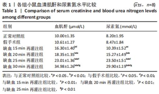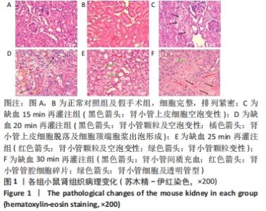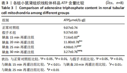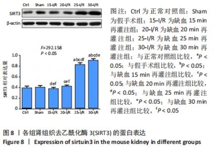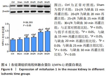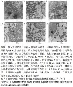 2.5 透射电镜下观察肾组织线粒体损伤情况 在透射电镜下放大20 000倍观察组织标本。正常对照组的线粒体超微结构正常,成簇排列在内质网周围,并且结构完好的线粒体大量存在。假手术组线粒体超微结构完整,整齐排列;缺血15 min再灌注组部分线粒体片段化,裂解,结构开始出现崩塌,但总体结构完整,且排列整齐;缺血20 min再灌注组可见部分区域内质网出现扩张,线粒体嵴部消失,肿胀、碎裂的情况更多见,部分线粒体完全崩解,且排列出现松散的趋势;缺血25 min再灌注组可见大量线粒体发生碎裂、崩解,几乎没有结构完整的线粒体保留,且线粒体的排列变得松散无序,内质网结构逐渐消失;缺血30 min再灌注组内质网结构崩塌,线粒体碎片化,结构消失,完全裂解,且正常线粒体数量大量减少,原有正常排列消失,见图3。"