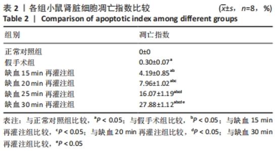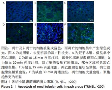 正常对照组的组织标本中未见明显的凋亡性改变;在假手术组凋亡水平很低,偶见单个凋亡细胞但与正常对照组存在差异(P < 0.05);缺血15 min再灌注组部分区域已有散在凋亡细胞出现,但总体凋亡水平仍较低,与假手术组比较差异明显(P < 0.01);缺血20 min再灌注组凋亡细胞数量有所增加,部分区域可见凋亡细胞聚集,每个聚集区域可见3-5个凋亡细胞,与缺血15 min再灌注组差异明显(P < 0.01);缺血25 min再灌注组凋亡细胞数量明显增加,凋亡细胞聚集频繁出现,且细胞聚集数目有所增加,与缺血20 min再灌注组比较差异明显(P < 0.01);缺血30 min再灌注组凋亡细胞大量出现,聚集趋势更为明显,同时部分区域可见正常的蓝色核数目减少,与缺血25 min再灌注组相比差异明显(P < 0.01),可见细胞凋亡水平随缺血时间延长而加重,见图2。 "