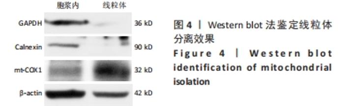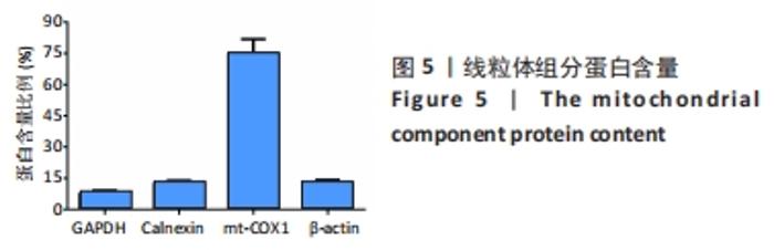 2.6 肾组织线粒体分离鉴定结果 按照试剂盒说明书要求,对组织标本进行线粒体分离操作。用Western blot法分别检测分离前后GAPDH、Calnexin、mt-COX1、β-actin蛋白的表达,见图4,计算其在线粒体组分以及胞浆组分中的蛋白灰度值,随后按照线粒体组分灰度/(线粒体组分灰度+胞浆组分灰度),计算线粒体组分蛋白含量比例。按照分离要求,GAPDH≤15%、Calnexin≤15%、mt-COX1≥60%、β-actin≤15%即为分离成功。结果显示,线粒体组分蛋白含量比例:GAPDH为(7.84±1.35)%、Calnexin为(12.61±1.32)%、mt-COX1为(74.95±6.95)%、β-actin为(12.8±1.46)%,见图5,各组数据有显著性差异(P < 0.05),各蛋白比例均符合要求,线粒体分离完成。"