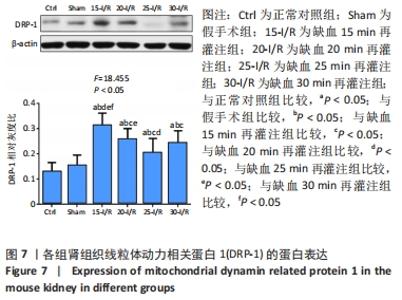 2.8.2 线粒体动力相关蛋白1蛋白水平 正常对照组线粒体动力相关蛋白1蛋白表达水平与假手术组比较差异无显著性意义(P > 0.05)。缺血15 min再灌注组线粒体动力相关蛋白1蛋白表达水平明显高于正常对照组及假手术组(P < 0.05);缺血20 min再灌注组线粒体动力相关蛋白1蛋白表达水平较缺血15 min再灌注组有所下降,但相比于正常对照组和假手术组升高(P < 0.05);缺血25 min再灌注组线粒体动力相关蛋白1蛋白表达水平较正常对照组及假手术组升高(P < 0.05),但与前两组相比有所下降(P < 0.05);缺血30 min再灌注组线粒体动力相关蛋白1蛋白表达水平处于缺血20 min及缺血25 min组之间,与上述两组分别比较,差异无显著性意义(P > 0.05),但与其余各组比较差异均有显著性意义(P < 0.05)。对线粒体动力相关蛋白1与缺血时间的关系进行整理,结果显示随着缺血时间延长,蛋白总体呈现先升高后降低趋势,于缺血15 min时出现高峰,随后下降,于30 min时仍未恢复正常,见图7。"