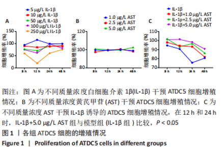 2.1 黄芪甲苷能减轻白细胞介素1β诱导的软骨细胞炎症反应 2.1.1 黄芪甲苷能提高白细胞介素1β诱导的软骨细胞活力 采用CCK-8法分析黄芪甲苷对白细胞介素1β诱导的软骨细胞活力的影响,见图1。图1A显示白细胞介素1β诱导的软骨细胞活性较空白对照组明显降低,且细胞活性与白细胞介素1β的浓度呈反比,考虑含250 μg/L白细胞介素1β的培养基中培养基的比例过低,为避免实验干扰,选择100 μg/L白细胞介素1β进行造模。图1B显示单独使用黄芪甲苷(1,2.5,5 μg/L)后细胞增殖率均接近100%,认为黄芪甲苷对细胞存活率没有明显影响。图1C显示白细胞介素1β诱导后的软骨细胞中加入黄芪甲苷(1,2.5,5 μg/L)干预后细胞存活率较模型组有所改善,其中改善效果最佳的黄芪甲苷质量浓度是5 μg/L,且药物起效时间在12-24 h之间,实验药物干预时间设定为18 h。"