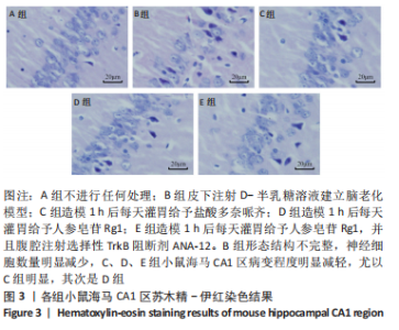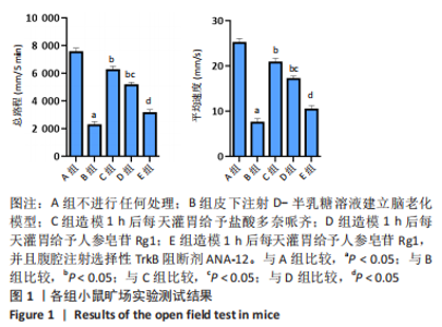 2.1 实验动物数量分析 50只昆明种小鼠全部进入结果分析,无脱落。 2.2 造模小鼠一般状态 A组小鼠好动,反应敏捷,精神状态良好,体毛光滑有光泽;B组小鼠在注射D-半乳糖期间逐渐出现精神萎靡、体毛干枯易落、反应迟钝、自发活动减少等现象。 2.3 各组小鼠旷场实验测试结果 与A组相比,B组小鼠旷场总路程、平均速度减少(P < 0.05),说明其认知能力严重受损;与B组相比,C、D组小鼠旷场总路程、平均速度增加(P < 0.05),说明给予盐酸多奈哌齐和人参皂苷Rg1治疗后,小鼠认知能力得到明显改善;D组小鼠旷场总路程、平均速度少于C组(P < 0.05);与D组相比,E组旷场总路程、平均速度减少(P < 0.05),表明ANA-12明显抑制了人参皂苷Rg1改善认知能力的作用,见图1。"