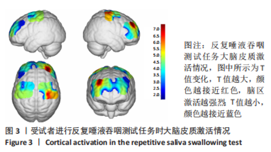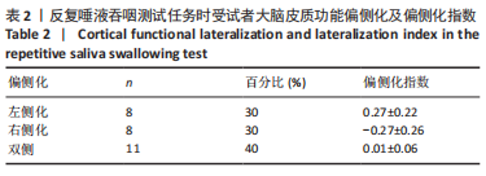 METHODS: Twenty-seven healthy subjects, aged (20.41±1.66) years, were enrolled, including 13 males and 14 females. All the subjects underwent the repetitive saliva swallowing test during functional near-infrared spectroscopy measure. The brain regions activated by the task were analyzed and the lateralization index of the activated brain regions was calculated.