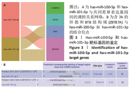 2.3 has-miR-100-5p和has-miR-101-3p靶标基因 通过miRTargetbase数据库和miRTarget数据库预测has-miR-100-5p和has-miR-101-3p 的调控靶标基因,并与共同差异表达基因比较。鉴定了has-miR-100-5p和has-miR-101-3p靶向CAMKK2、EIF5A、PIM1、ZBTB7A的调控网络,见图3A。其中,ZBTB7A同时被has-miR-100-5p和has-miR-101-3p所调控,被认为是关键靶标基因。miRTargetbase数据库中预测的ZBTB7A与has-miR-100-5p和has-miR-101-3p的结合位点,见图3B。"