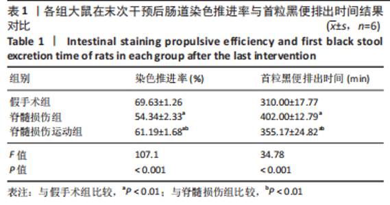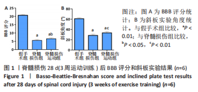 METHODS: The modified spinal cord percussion method was used to prepare a rat model of T10 incomplete spinal cord injury. A total of 54 female Sprague-Dawley rats were randomly divided into a sham-operated group, a model group, and a training group, with 18 rats in each group. The treadmill training was started 7 days after modeling for 3 weeks. After the final intervention, the Basso-Beattie-Bresnahan score and the inclined plate test were used for locomotor testing. Spinal cord tissue samples were taken 0.5 cm above and below the injured site to detect neuronal survival and astrocyte activation levels for testing the effect of exercise on neurological function. The intestinal transport function was evaluated by gavage staining of the first black stool and intestinal staining propulsive efficiency in each group. At 14, 21 and 28 days after spinal cord injury, the pathological structural changes of the small intestine were observed by hematoxylin-eosin staining and the expression of the small intestinal tight junction protein Occludin was detected by immunofluorescence; the expression levels of apoptosis-related proteins Bcl-2, Caspase-9, Bax, Caspase-3, and Cyt-C were detected by western blot.