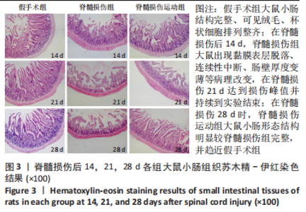 RESULTS AND CONCLUSION: Compared with the model group, the training group had recovered neurological function with higher Basso-Beattie-Bresnahan scores and inclined plate angles (P < 0.05), more survived neurons, and less neuroinflammation. At 14 days after spinal cord injury, compared with the sham-operated group, the small intestinal tissue in the model and training groups showed pathological changes, such as mucosal layer disruption, intestinal villus atrophy, reduced number of cup cells, and nuclear consolidation. The pathological damage of the small intestine in the model group peaked at 21 days after spinal cord injury and lasted until the end of the experiment. The pathological changes such as mucosal continuity and intestinal villus atrophy in the training group showed significant improvement at 28 days after surgery. The first black stool time in the training group was lower than that in the model group (P < 0.05), and the intestinal propulsive efficiency was higher than that in the model group (P < 0.05), suggesting that the intestinal transport function improved. At 28 days after spinal cord injury, the expression of the small intestinal tight junction protein Occludin was higher in the training group than the model group (P < 0.01), as well as the Bcl-2 expression (P < 0.05) but the expression of apoptosis-related proteins Caspase-3, Caspase-9, Bax Caspase-9, Bax, and Cyt-C was decreased (P < 0.05). To conclude, the treadmill training can protect the nervous system and small intestinal system in rats with spinal cord injury and the recovery of small intestine function may be related to the level of apoptosis in small intestine tissue.
