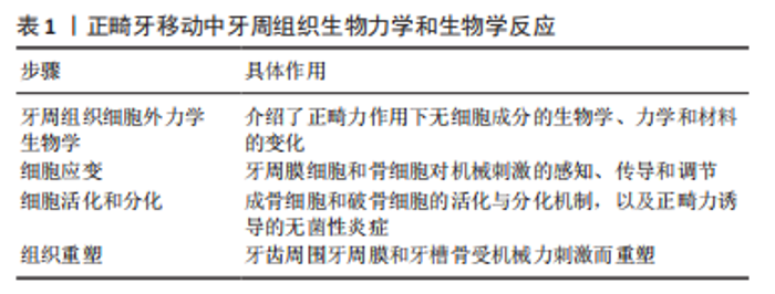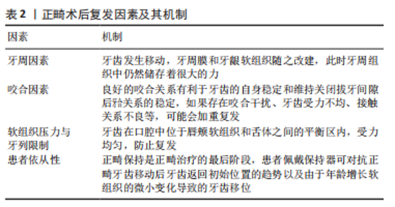 牙槽骨是牙齿的支持组织,是人体骨骼代谢最活跃的部分,可依据牙齿功能形态的改变而改变。牙骨质较牙槽骨抗吸收性更强,且随年龄的增长而逐渐沉积。牙与牙槽骨通过牙周膜相连,牙周膜具有形成、营养、感觉和支持的功能,可进行自我更新和改建。当受到刺激时,牙齿、牙周膜以及牙槽骨可作为一个整体对刺激做出应答,并保持自身的相对稳定。所以当矫治力作用于牙齿上,牙槽骨的可塑性、牙骨质的抗压性以及牙周膜内环境的稳定性是牙齿正畸运动中最基本的生物学基础,也是牙周组织重建的基础[10]。 正畸治疗的任何阶段都可能诱发牙根吸收,是仅次于牙釉质白斑病变的第二大正畸并发症,会引起牙冠根比降低,造成牙齿松动、脱落,对牙齿寿命以及治疗结果稳定性造成损害。当正畸压力超过局部毛细血管压力时,由于塌陷和局部供血不足,牙周韧带会发生缺血性坏死,导致牙齿外部透明层的退化。由于前牙骨质及其形成的成牙骨质细胞层的缺损,破骨细胞被激活,并且在去除透明液化坏死组织期间开始进行牙根吸收。因此,当损害超过牙骨质自身修复能力时,牙本质就会暴露,破牙细胞导致牙根结构产生不可逆转的损失[11]。临床医生多通过数字化根尖片、锥形术CT等对牙根吸收监测评估[12]。有研究显示,正畸导致的牙根吸收可能与患者年龄、种族、牙位前后、拔牙与否、牙齿移动方式、矫治力大小、作用时间和矫治方式等有关[13-14]。牙根吸收最终由成牙骨质细胞修复,但仍可能导致牙根长度的永久性缺失,正常牙齿和根管治疗后的牙齿会受到同样的影响[15]。如果在牙齿矫正时监测到牙根的吸收,应立即停止治疗两三个月,防止进一步吸收并希望牙骨质愈合。若愈合后再次发生牙根吸收,应修改治疗计划[16]。很多患者因为初戴矫治器,口腔环境发生了变化,弓丝、颊管、带环、结扎丝等会造成黏膜溃疡。一般溃疡多发生于前2周,2周之后,口腔内环境稳定、患者适应性增强,溃疡发生率降低。 正畸牙齿移动会导致牙齿周围的牙龈和牙周组织平衡被打破并需要一段时间才能得到修复,拉伸的牙周纤维中仍然存在残余应力促使牙齿回复到最初位置,最终导致正畸术后复发[17]。有研究显示,正畸术后复发与多方面因素有关[18-19],见表2。正畸治疗后患者的依从性与术后复发的OR值为0.86,同样也是复发的重要因素[20]。"