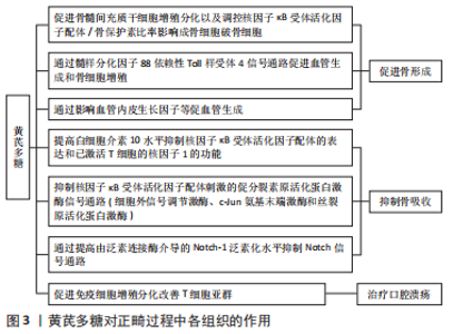 2.2.1 对牙周组织改建的作用 牙周组织改建是正畸过程中牙齿移动的生物学基础。牙齿受到矫治力,会引起牙周组织的炎性反应,从而刺激各种生化介质和信号的释放,最终造成牙槽骨及牙周韧带重塑[21],骨髓间充质干细胞在一定条件下可分化为成纤维细胞、破骨细胞、成骨细胞、脂肪细胞等,还可分化为有特定功能的器官或组织[22-23],此外,骨髓间充质干细胞的特点是易采样、易分离、体外扩增等,已成为组织工程常用的种子细胞[24],能支持骨微环境稳态并保持骨改建平衡[25-27]。黄芪多糖作为黄芪主要成分,其促血管生成、修复创面和抗炎作用等已经被广泛研究[28],同时又能改善微循环障碍,抗氧化,抑制细胞凋亡[29]。据报道,黄芪多糖能通过血管内皮生长因子分泌促进骨髓间充质干细胞的增殖[30],YANG等[31]发现骨髓间充质干细胞暴露于柠檬酸铁铵中活性会降低,而黄芪多糖可部分减弱这些细胞的凋亡和衰老,在柠檬酸铁铵处理后,多能基因Nanog、Sox2和Oct4在骨髓间充质干细胞中被下调,但黄芪多糖抑制Nanog、Sox2和Oct4表达的降低。进一步的研究发现,黄芪多糖治疗消除了柠檬酸铁铵处理的骨髓间充质干细胞中细胞内线粒体活性氧水平增加,增加的活性氧水平在细胞凋亡的发展中起关键作用[32-33]。所以,黄芪多糖可通过调控骨髓间充质干细胞中线粒体活性氧的水平控制细胞的凋亡和衰老来影响骨髓间充质干细胞分化为成骨细胞、破骨细胞的能力,从而实现对牙周组织改建的调控。 以往有研究提出,基质金属蛋白酶在正畸治疗中起着关键作用,导致牙周重塑和牙齿移动,基质金属蛋白酶可由机械力诱导。LISBOA等[34]将原代培养的人牙周成纤维细胞置于脂多糖和Pam3Cys的作用下离心,Toll样受体4和Toll样受体2分别为其配体,采用抗体列阵、酶联免疫吸附实验以及免疫印迹法检测基质金属蛋白酶、肿瘤坏死因子α、白细胞介素1β、丝裂原活化蛋白激酶、c-jun氨基末端激酶以及核因子κB,发现与离心相关的Toll样受体激活后,基质金属蛋白酶1,3,10分泌增加,丝裂原活化蛋白激酶、c-jun氨基末端激酶以及核因子κB磷酸化增加,这些结果表明,Toll样受体激活和机械力刺激联合诱导培养的牙周成纤维细胞分泌基质金属蛋白酶是通过丝裂原活化蛋白激酶、c-jun氨基末端激酶以及核因子κB途径调节的。Toll样受体激活引起基质金属蛋白酶增加可能是正畸治疗中的重要因素。由于牙移动是一个复杂的生物学反应,因此对于Toll样受体参与牙周组织改建的具体机制,还需进一步深入研究。 QIU等[35]通过实验探讨黄芪多糖是否通过Toll样受体4信号通路在生长内皮细胞和原代人成骨细胞的共培养中促进血管生成或血管形成;他们用不同浓度的黄芪多糖处理共培养物24 h,然后又处理7 d,随后进行测量;又将黄芪多糖添加到生长内皮细胞和原代人成骨细胞的单一培养基中,以评估增殖、细胞凋亡、血管生成、成骨、Toll样受体4信号通路和炎症细胞因子释放。最终发现黄芪多糖在0.4 mg/mL的最佳浓度下促进了共培养物中的血管生成,黄芪多糖激活Toll样受体4/髓样分化因子88提高了Toll样受体4/髓样分化因子88的表达水平,并增强了生长内皮细胞和原代人成骨细胞单一培养中的血管生成和成骨作用;在黄芪多糖处理后,E-选择蛋白黏附分子,3种细胞因子(白细胞介素6、肿瘤坏死因子α、γ-干扰素)以及血管内皮生长因子和血小板源生长因子的水平显著增加,因此,黄芪多糖似乎通过Toll样受体4信号通路促进共培养系统中的血管生成和骨化。HUO等[36]通过研究证实黄芪多糖具有抗去卵巢小鼠骨质疏松症的作用,并呈剂量依赖关系。黄芪多糖通过增加小鼠骨保护素(osteoprotegerin,OPG)的产生和下调细胞核因子 κB 受体活化因子配体(receptor activator ofnuclear factor-κB ligand,RANKL)的表达,使得RANKL/OPG比值降低,对小鼠的骨丢失产生保护作用,这种作用的分子机制是黄芪多糖可减少骨吸收并抑制破骨细胞的合成。YANG等[37]经研究证实,黄芪多糖能够促进血管再生以及骨形成,其机制可能与黄芪多糖通过影响血管内皮生长因子等物质促进血管生成有关。以上多个研究证实黄芪多糖能通过多途径作用于成骨细胞,促进成骨,加快牙周骨组织改建,见图4。"