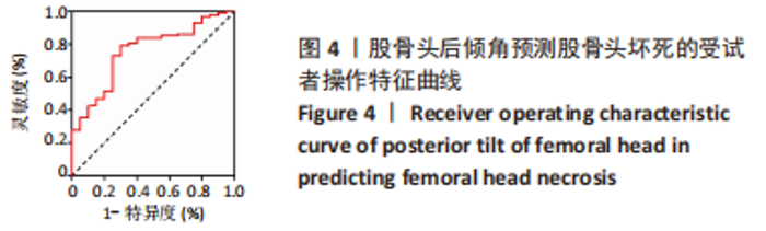 METHODS: The clinical data of 150 patients with impacted femoral neck fractures admitted to Tianjin Hospital from 2016 to 2020 were retrospectively analyzed. The posterior tilt of the femoral head was measured by a three-dimensional reconstruction technique according to postoperative femoral head necrosis. The patients were divided into the necrosis group and the non-necrosis group. The clinical data were compared between the two groups using single-factor analysis. Risk factors of femoral head necrosis were analyzed by multivariate logistic regression analysis. The predictive value of posterior tilt for postoperative femoral head necrosis was assessed using receiver operating characteristic curves.