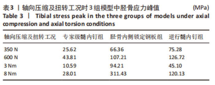 RESULTS AND CONCLUSION: (1) When the three groups of internal fixators were loaded under two load conditions, the peak stress of the expert tibial nail group was 283.53 MPa at the unlocked main nail hole under the torsion condition. In the medial distal tibial plate group, the stress peak was located on the third screw, which was 913.07 MPa under the torsional condition. In the retrograde tibial nail group, the stress peak was at the second main nail hole under the torsion condition, which was 435.42 MPa. In the retrograde tibial nail group, the stress peak of the cortical bone around the main nail hole at the medial malleolus appeared under high axial compression condition, which was 55.34 MPa. (2) In terms of fracture gap micromovement, the expert tibial nail group had the highest tangential displacement in the four regions under axial compression load. The axial displacement of the four regions in the medial distal tibial plate group was the highest, and the maximum value was in the lateral region. The peak axial displacement of the expert tibial nail group and retrograde tibial nail group was located in the posterior region. (3) When the axial torsional load was loaded, the peak axial displacement of the medial distal tibial plate group and retrograde tibial nail group was in the lateral region, and the tangential displacement of the four regions in the retrograde tibial nail group was smaller than that in the medial distal tibial plate group and expert tibial nail group. (4) It is indicated that retrograde tibial nail has a biomechanical advantage over the medial distal tibial plate and expert tibial nail in distal tibial fractures in terms of fracture end fretting and internal fixation stress.