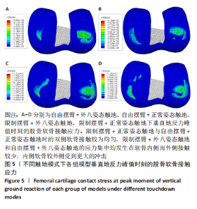 RESULTS AND CONCLUSION: (1) There was an interaction between arm swing and ankle posture on knee kinematics. Limiting the swing arm and changing the contact posture of the ankle joint would have a significant impact on the kinematics characteristics of the knee joint in the sagittal plane and frontal plane (P < 0.001, P < 0.001). (2) When the limited swing arm + normal posture touchdown and the free swing arm + normal posture touchdown, the bilateral cartilage contact was more uniform. The stress concentration of the limited swing arm + toe-out posture touchdown and the free swing arm + toe-out posture touchdown occurred on the inner side of the cartilage and the stress on the outer side was less. The inner cartilage was more impacted than the outer side. The peak contact stresses of femoral cartilage (8.89 MPa) and meniscus (10.71 MPa) were lower when the swing arm combined with toe-out touched the ground, while the peak contact stresses of femoral cartilage (13.11 MPa) and meniscus (11.23 MPa) were higher when the swing arm combined with toe-out was limited. (3) These findings indicate that the correct arm swing and the appropriate toe-out posture landing can reduce the risk of knee joint injury. When the ankle joint touches the ground in toe-out posture and limits the arm swing during jumping, the contact stress of the femoral cartilage will be significantly increased, possibly increasing the risk of knee joint injury.
