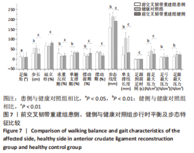 2.7 ACLR组患侧、健侧与健康对照组在步行时的平衡及步态特征分析 步行时,ACLR组患侧与健康对照组相比,步态线长度和单支撑线长度明显减小,差异有显著性意义(P < 0.05);患侧足偏角、承重反应期及摆动前期明显增加,步长、单腿支撑期显著减小,差异均有显著性意义(P < 0.05);同时患侧前足最大压力、足弓最大压力及足跟最大压力均明显降低,差异有显著性意义(P < 0.05);患侧站立相、摆动期及足跟到前足时间无显著变化(P > 0.05)。 步行时,ACLR组健侧与健康对照组相比,健侧的步态线长度和单支撑线长度均小于健康人,差异有显著性意义(P < 0.05);健侧站立相、承重反应期、摆动前期及足跟到前足时间均延长,步长及摆动期缩短,差异有显著性意义(P < 0.05);ACLR患者健侧前足最大压力低于健康人(P < 0.05),但足弓和足跟最大压力无明显差异(P > 0.05);健侧的足偏角和单腿支撑期与健康对照组相比差异无显著性意义(P > 0.05)。见图7。"