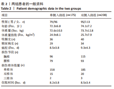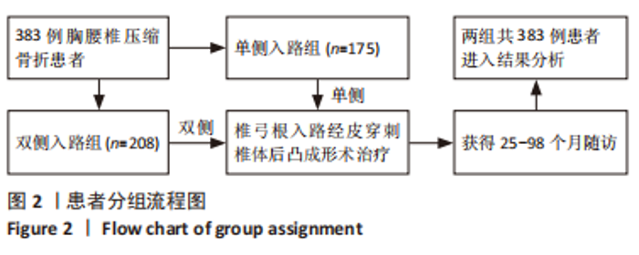 METHODS: 383 patients with osteoporotic vertebral compression fractures of the thoracic and lumbar spine were operated on from March 2014 to April 2020 via bipedicular approach (bipedicular group, 208 cases) and unipedicular approach (unipedicular group, 175 cases) percutaneous kyphoplasty. All patients were followed-up using the Oswestry dysfunction index, visual analog scale score and X-ray inspection preoperatively and postoperatively. The operation time, blood loss, amount of bone cement injected, frequency of X-ray exposure, Cobb angle of vertebral kyphosis, vertebral body leading edge height, intermediate height, cement leakage rate, and incidence of adjacent vertebral body re-fracture were measured and compared between the two groups.