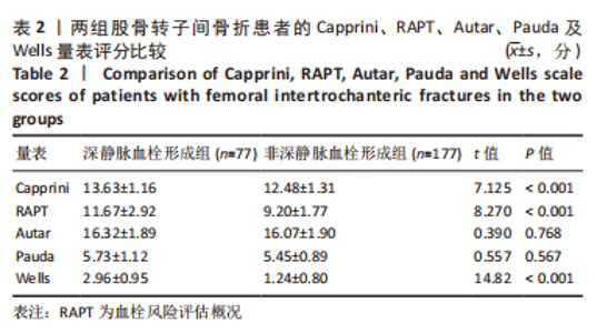 METHODS: The data of 254 patients with intertrochanteric fractures admitted to the Department of Orthopedics, Affiliated Hospital of Southwest Medical University from July 2016 to July 2021 were retrospectively analyzed. According to the examination results of the lower extremity venous ultrasound, the patients were divided into the deep vein thrombosis group and the non-deep vein thrombosis group. Capprini, RAPT, Autar, Pauda and Wells scales were used to evaluate the possible risk of deep vein thrombosis in patients. The scores of five thrombosis risk assessment scales were compared between the two groups. Simultaneously, the receiver operating characteristic curve was drawn and the area under the curve was calculated to analyze the predictive value of five thrombosis risk assessment scales for lower extremity deep vein thrombosis in patients with intertrochanteric fracture.