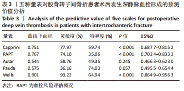 RESULTS AND CONCLUSION: (1) The Wells score, Autar score and RAPT score in the deep vein thrombosis group were significantly higher than those in the non-deep vein thrombosis group (P < 0.05). (2) The areas under the curve of Wells, Capprini, RAPT, Autar and Pauda were 0.916, 0.751, 0.767, 0.544 and 0.575, respectively. (3) The sensitivities of Wells, Capprini, RAPT, Autar and Pauda in the diagnosis of deep vein thrombosis in patients with intertrochanteric fracture were 93.22%, 77.97%, 74.01%, 58.76% and 36.16%, respectively. The specificities were 64.94%, 59.74%, 35.06%, 49.35% and 74.03%, respectively. (4) All the above five thrombosis risk assessment scales have certain predictive values for the occurrence of deep vein thrombosis in the lower extremity of hospitalized patients with intertrochanteric fracture, but the Wells risk assessment scale has a relatively high predictive value, followed by Capprini and RAPT assessment scale. The risk assessment value of Wells scale is relatively accurate for whether the patients with intertrochanteric fracture have thrombus. The RAPT scale is applicable to the risk assessment of possible thrombosis in all orthopedic trauma patients.