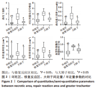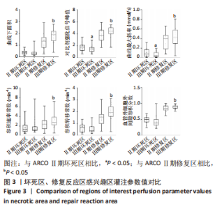 RESULTS AND CONCLUSION: (1) Comparing the perfusion parameters in different regions, the peak value of enhanced signal intensity, area under the curve, maximum slope, volume transfer constant, and the median volume fraction of extravascular extracellular space in the necrotic region were lower than those of the greater trochanter, and the differences were statistically significant (P < 0.05). There was no statistically significant difference in the volume rate constant (P > 0.05). (2) The signal peak value, area under the curve, maximum slope, volume transfer constant, rate transfer constant, and the median ratio of extravascular to extracellular space in the repair reaction area were higher than those in the necrotic area and the greater trochanter, and the differences were statistically significant (P < 0.05). (3) The median signal peak value and maximum slope of the necrotic area in ARCO stage II were greater than those in ARCO stage III, and the difference was statistically significant (P < 0.05). There were no significant differences in area under the curve, rate transfer constant, volume transfer constant and the median ratio of extravascular to extracellular space (P > 0.05). (4) The signal peak value, area under the curve, maximum slope, volume transfer constant, rate transfer constant, and ratio of extravascular to extracellular space in the repair reaction zone of the ARCO Stage II were lower than those of the ARCO Stage III, and the difference was statistically significant (P < 0.05). (5) It is concluded that the microcirculation perfusion velocity, blood flow and capillary permeability in the necrotic area of the femoral head were significantly reduced, while the microcirculation perfusion velocity, blood flow and vascular permeability in the repair reaction area were significantly improved compared with those in the normal area. With the occurrence of collapse, the perfusion velocity and blood flow were further reduced, and the perfusion in the repair reaction zone was enhanced.