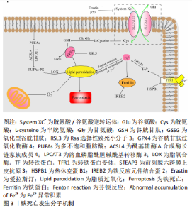 2.1 铁死亡概述及发生机制 细胞死亡在生物体生命活动中扮演至关重要的角色。细胞死亡根据是否受到自身基因调控分为调控性细胞死亡和偶发性细胞死亡[21],其中调控性细胞死亡主要包括凋亡、焦亡和自噬等。随着对细胞死亡机制的深入研究,2012年DIXON等[22]将铁离子依赖性PUFAs过氧化物蓄积引起细胞死亡的方式命名为铁死亡。铁死亡也属于调控性细胞死亡,但在形态学表现和生化特征上区别于其他类型的调控性细胞死亡。铁死亡形态学特征主要表现包括线粒体体积缩小、嵴模糊不清、外膜破裂、膜密度增加,细胞核膜完整[23]。在生化特征上表现为胱氨酸/谷氨酸逆转运体(cystine/glutamate antiporter system,System Xc-)被抑制、谷胱甘肽合成下降、谷胱甘肽过氧化物酶4(glutathione peroxidase 4,GPX4)活性下降、铁离子和PUFAs过氧化物蓄积。随着对铁死亡机制的深入研究,发现其发生与铁离子异常积蓄、PUFAs过氧化和氨基酸异常代谢等因素密切相关,见图3。"