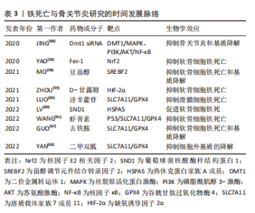 2.3 铁死亡与骨关节炎 骨关节炎是以慢性炎症、关节软骨进行性退变、骨质增生硬化及继发骨赘形成为特征的一种关节疾病[55]。目前,铁死亡与骨关节炎发生的研究较少,现有的研究表明其可通过调控软骨细胞活性、细胞外基质降解和滑膜炎症等病理生理过程,进而参与骨关节炎疾病进程。 软骨细胞是关节软骨中唯一的细胞类型,铁死亡导致软骨细胞丢失在骨关节炎进展中发挥重要的作用。使用白细胞介素1β、柠檬酸铁铵诱导的骨关节炎细胞模型中,软骨细胞中铁死亡标志分子GPX4和SLC7A11表达下降,P53和ACSL4表达上升;下调经白细胞介素1β、柠檬酸铁铵诱导的软骨细胞中Nrf2水平时,GPX4的表达水平下降;而通过关节内注射Fer-1发现其可以逆转软骨细胞中铁死亡相关蛋白表达的变化,并促进Nrf2抗氧化系统激活从而抑制软骨细胞铁死亡延缓骨关节炎,因此Nrf2抗氧化系统和铁死亡是相互调控的,但具体机制尚不清楚[56]。 通过分析骨关节炎和非损伤人软骨组织样本中铁死亡调节因子GPX4、SLC3A2和SLC7A11表达水平,结果显示骨关节炎软骨中GPX4和SLC3A2表达显著降低。进一步用泛半胱天冬酶抑制剂、坏死性凋亡抑制剂、Fer-1和去铁胺分别处理骨关节炎细胞模型时,发现Fer-1和去铁胺可降低细胞内活性氧、PUFAs过氧化物蓄积,恢复GPX4活性,从而抑制软骨细胞铁死亡,而这个过程不能被泛半胱天冬酶抑制剂和坏死性凋亡抑制剂所抑制[57]。 铁死亡对软骨细胞活性的影响受到多种机制调控。MO等[58]研究证实了豆甾醇可通过下调甾醇调节元件结合转录因子2来减轻白细胞介素1β诱导的ATDC5细胞铁死亡发生。ZHOU等[59]学者发现D-甘露糖处理可上调白细胞介素1β诱导的软骨细胞中GPX4和SLC7A11水平,缺氧诱导因子2α过表达则可抑制D-甘露糖的作用,而Fer-1可减弱缺氧诱导因子2α过表达对D-甘露糖的抑制作用,所以D-甘露糖通过抑制缺氧诱导因子2α来降低软骨细胞铁死亡敏感性从而减轻骨关节炎进展。最近的研究表明骨关节炎大鼠软骨组织中GPX4和热休克蛋白家族A成员5表达水平降低,而葡萄球菌核酸酶样结构蛋白1(staphylococcal nuclease domain containing 1,SND1)在骨关节炎中表达升高。进一步研究发现,白细胞介素1β刺激的原代软骨细胞中SND1表达增加,增加的SND1抑制了热休克蛋白家族A成员5表达导致GPX4降解增加,而敲除SND1可上调大鼠软骨中热休克蛋白家族A成员5水平和增加GPX4表达。因此,降低SND1的水平可促进热休克蛋白家族A成员5的表达,从而增加GPX4的活性,延缓骨关节炎进展[60]。虾青素是一种具有抗氧化作用的类胡萝卜素,其可以通过下调P53表达来缓解白细胞介素1β诱导的SLC7A11、GPX4、谷胱甘肽和铁蛋白的表达下降,从而抑制软骨细胞铁死亡的发生[61]。 关节软骨的绝大部分成分由细胞外基质组成,抑制铁死亡的发生可减缓细胞外基质降解从而缓解骨关节炎进展。YAO等[56]通过关节内注射Fer-1,发现Fer-1可以缓解Ⅱ型胶原降解从而减轻软骨退化和骨关节炎进展,通过进一步研究表明Fer-1可减轻白细胞介素1β和柠檬酸铁铵对胶原蛋白Ⅱ的抑制,但是Fer-1并不减少白细胞介素1β和柠檬酸铁铵诱导的基质金属蛋白酶13 表达。而又有研究表明Fer-1可以减少白细胞介素1β诱导的基质金属蛋白酶13的表达[60,62]。除了Fer-1可以抑制铁死亡引起的细胞外基质降解外,去铁胺也可逆转爱拉斯汀和白细胞介素1β诱导的基质金属蛋白酶13表达上调、胶原蛋白Ⅱ表达下调[62]。豆甾醇可以通过下调甾醇调节元件结合转录因子2来调节基质金属蛋白酶13、Ⅱ型胶原和蛋白多糖的表达水平,从而减轻白细胞介素1β诱导的铁死亡和细胞外基质降解[58]。二甲双胍治疗也可以部分减轻由关节内注射Erastin而导致的蛋白多糖丢失,从而减轻细胞外基质降解,延缓骨关节炎进展[63]。 骨关节炎另一个重要特征是滑膜炎,滑膜炎会导致软骨退化,还与关节疼痛以及关节功能障碍密切相关[64]。为了探索铁死亡是否与滑膜炎相关,MIAO等[57]检测了骨关节炎患者滑液中铁的水平,结果表明滑液中铁离子水平随着骨关节炎的进展而增加。经过脂多糖诱导的滑膜炎细胞模型中,铁死亡标志分子GPX4、SLC7A11和SLC3A2L的表达明显下降,淫羊藿苷以浓度依赖性方式上调GPX4、SLC7A11和SLC3A2L的表达水平;淫羊藿苷还抵消了RSL3诱导的滑膜细胞中铁死亡相关蛋白表达、PUFAs过氧化物和铁离子的蓄积[65]。JING等[66]的研究发现,骨关节炎中的炎症因子通过上调铁输入蛋白转铁蛋白受体1和DMT1,下调铁流出蛋白铁转运蛋白,干扰铁稳态导致铁超载。铁超载可通过上调基质金属蛋白酶13的表达,加重炎症反应和细胞外基质降解。抑制DMT1可阻断MAPK和PI3K/AKT/NF-κB通路,从而抑制铁超载导致的炎症反应和细胞外基质降解。XIA等[67]通过生物信息学分析,发现7个铁死亡差异表达基因包括ATF3、IL6、CDKN1A、IL1B、EGR1、JUN和CD44具有良好的诊断特性,可作为骨关节炎中滑膜炎的诊断生物标志物和治疗靶点,进一步阐明了骨关节炎的发病机制。滑膜炎中的炎症反应也可直接激活铁死亡,从而参与骨关节炎疾病进展。 铁死亡与骨关节炎的研究机制及时间发展脉络见表3。"