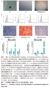 2.1 PDLSCs分离、培养、表面标志物表达及多向分化能力鉴定 应用经典酶消化法获得PDLSCs,细胞在分离培养5 d后顺利贴壁生长,细胞排列稀疏、不规则,呈散在的纺锤样结构,胞体形态丰满,胞核呈卵圆性,见图1A。细胞传代实验和克隆形成实验均显示细胞增殖生长的速度相较于初期呈明显的几何级数增长,约3 d就可增长到培养器皿底面的95%,见图1B;单克隆实验显示有显著的细胞集落群形成,呈漩涡状,见图1C。同期,流式细胞仪检测培养的PDLSCs可阳性表达间充质干细胞表面标记物STRO-1(15.6%)、CD146(42.85%);阴性表达血小板内皮细胞标志分子CD31(0.527%)及白细胞共同抗原CD45(1.61%),见图1D。细胞经成骨及成脂向分化诱导培养后,经相应的染色处理,各组细胞可分别呈现粉染的碱性磷酸酶、红染的钙结节和胆红素串珠样的脂滴,成骨和成脂相关基因均较空白对照组呈上升趋势,提示实验培养的细胞具有骨向分化和脂肪向分化的潜能,见图1E-I。以上结果证实课题组分离、培养的细胞符合PDLSCs的生物学性能,培养成功。"