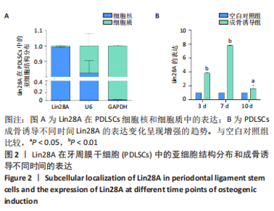 2.2 Lin28A在PDLSCs中亚细胞定位分布及成骨分化过程中呈差异表达 利用核质分离检测方法对PDLSCs的细胞核RNA及细胞质RNA进行分离、提纯、测定,结果显示:Lin28A在PDLSCs的细胞质和细胞核中均有表达,但多集中位于细胞的细胞核内,其在细胞质中的表达量仅是细胞核中表达量的3%,见图2A。在PDLSCs成骨诱导的不同时间点,Lin28A也呈不同程度的增长趋势:成骨诱导3 d时,Lin28A的表达量是对照组的3.8倍(P < 0.01);成骨诱导7 d时,Lin28A的表达量是对照组的7.7倍(P < 0.01);成骨诱导10 d时,Lin28A的表达量是空白对照组的1.4倍(P < 0.05),说明Lin28A在PDLSCs成骨诱导分化过程中呈阳性表达,其中7 d组Lin28A表达变化最显著,见图2B。"
