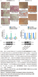 2.4 各组PDLSCs成骨诱导后成骨检测指标的比较 经不同慢病毒载体转染的PDLSCs模型给予相应的成骨诱导。成骨诱导7 d,早期指标碱性磷酸酶染色结果显示,过表达Lin28A组的细胞染色较深,而干扰Lin28A表达组碱性磷酸酶染色较少,成骨能力较弱,过表达空载体组和干扰表达空载体组的染色结果与空白对照组基本一致,没有明显的染色差异,见图4A。各组细胞在成骨诱导21 d后,成骨晚期茜素红染色结果显示:过表达Lin28A组细胞红染的钙结节明显、量多;而干扰Lin28A表达组钙结节形成较少,镜下视野呈现出量少或几乎没有的状态,成骨能力显著降低;同期,过表达空载体组和干扰表达空载体组的钙化结节形成量与空白对照组无明显差别,见图4B。收集骨向诱导14 d的各组细胞总RNA,检测每组细胞中成骨标志基因的mRNA表达水平,仍以GAPDH为参照基因。与空白对照组相比较,转染过表达Lin28A载体的PDLSCs成骨基因碱性磷酸酶、Runt相关转录因子2及骨桥蛋白的表达量显著升高,而转染过表达空载体的PDLSCs成骨基因表达水平与空白对照组相比无明显差异,说明过表达Lin28A可以促进PDLSCs成骨向分化各项成骨指标高表达;转染干扰Lin28A表达载体的PDLSCs其成骨基因的表达水平显著下降,转染干扰表达空载体的PDLSCs成骨基因的表达水平与空白对照组比较无明显差异,说明干扰Lin28A表达后PDLSCs的骨向分化能力减弱,得出与过表达Lin28A相反的结果,见图4C,D。经成骨诱导分化,5组细胞的成骨相关蛋白Runt相关转录因子2的表达趋势与成骨基因表现的趋势一样,即过表达Lin28A组的Runt相关转录因子2蛋白表达相较空白对照和空载体对照组显著增高(P < 0.05),见图4E;而干扰Lin28A表达后,PDLSCs的成骨相关蛋白Runt相关转录因子2的表达量明显降低(P < 0.01),见图4F。"