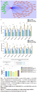 2.5 Lin28A相关的靶向RNA预测和成骨诱导培养验证 应用生物信息学预测软件Starbase V2.0 (http://starbase.sysu.edu.cn/mirlncRNA.php)和TargetScan Human 8.0(http:// www.TargetScanHuman 8.0)找出与Lin28A相关联的miRNAs,并分析了miRNA与Lin28A相互间存在的结合位点,找出2个预测软件共有的miRNA,见图5A。通过PubMed、CNKI、Web of Science等文献数据库,检索和综合分析前期的预测结果,筛选出可与Lin28A有调控功能作用的let7家族成员(分别为let-7a、let-7b、let-7c、let-7d、let-7e、let-7f、let-7g和let-7i);利用qRT-PCR检测常规培养基和成骨诱导培养基培养的PDLSCs的总RNA,发现let-7a和let-7c随Lin28A的表达差异而发生明显的变化,以let-7a的表达趋势最显著,见图5B,C;后续的双荧光素酶结合实验证实let-7a与Lin28A的3’-UTR直接结合,是PDLSCs成骨分化过程中Lin28A的靶标RNA,见图5D-E。"