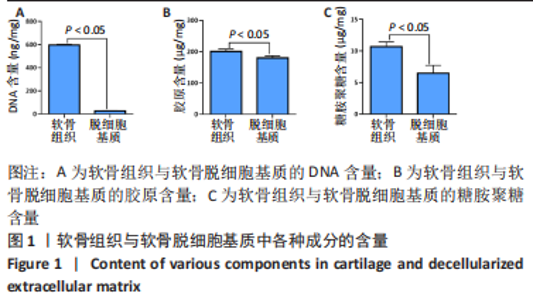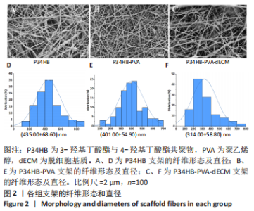 经过酶、化学及超声振荡洗涤处理后,所制备的软骨dECM中残余的DNA含量为(25.53±2.06) ng/mg,较正常软骨组织DNA含量(595.83±6.35) ng/mg明显减少(P < 0.05 ),去除DNA含量约95%。dECM中的胶原含量(179.53±7.20) μg/mg,较软骨组织中的胶原含量(200.43±7.78) μg/mg降低(P < 0.05),保留了胶原约90%;dECM中的糖胺聚糖含量为(6.48±1.23) μg/mg,较正常软骨组织的糖胺聚糖含量(10.69±0.74) μg/mg降低(P < 0.05),保留了糖胺聚糖约60%。 2.2 各组支架物理性能表征结果 2.2.1 各组支架形态学观察 各组支架扫描电镜观察结果如图2所示,各组支架纤维呈随机分布,纤维之间互相连接呈现多孔结构。通过测量各组支架的纤维直径,P34HB支架的纤维直径为(435.00±68.60) nm,P34HB-PVA支架纤维直径为(401.00±54.90) nm,P34HB-PVA-dECM支架的纤维直径为(314.00±58.80) nm。"