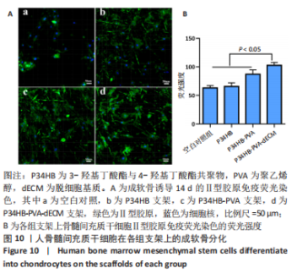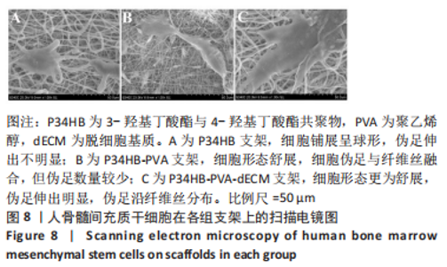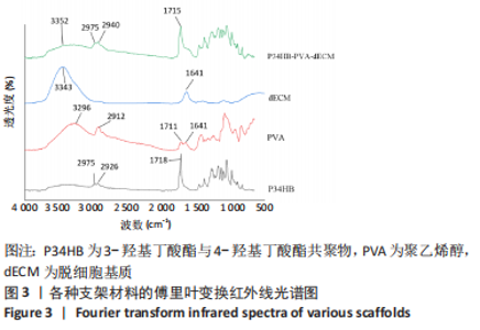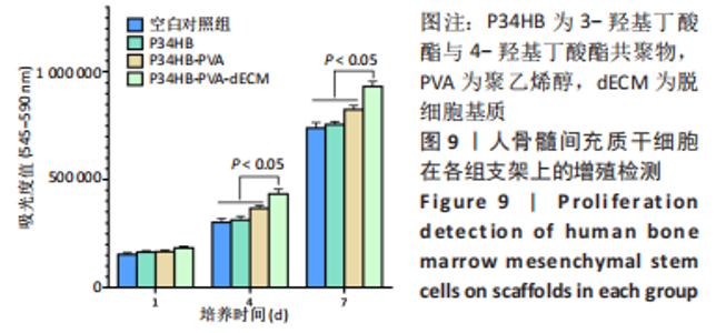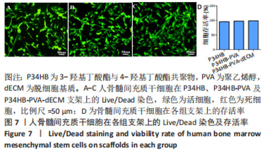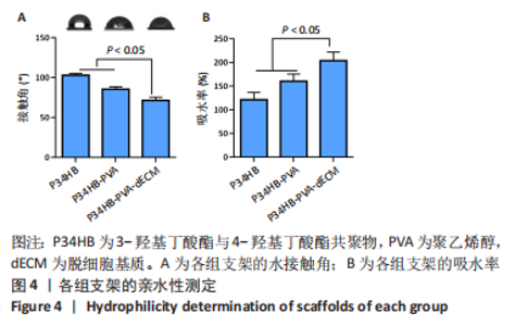 2.2.3 各组支架亲水性能检测结果 P34HB、P34HB-PVA、P34HB-PVA-dECM支架的接触角分别为(102.91±2.21)°,(85.44±2.96)°,(71.42±4.01)°;与其他组相比,P34HB-PVA-dECM支架的水接触角最小(P < 0.05),见图4A。各组支架的吸水率结果如图4B所示,P34HB、P34HB-PVA、P34HB-PVA-dEC支架的吸水率分别为(121.04±15.49)%,(160.38±15.20)%,(203.75±17.99)%,P34HB-PVA-dECM支架的吸水率最高(P < 0.05),说明P34HB-PVA-dECM支架的亲水性最好。"