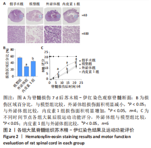 2.2 大鼠脊髓组织苏木精-伊红染色结果及运动功能评价 脊髓损伤后7 d,病理检测结果显示,假手术组脊髓组织分布均匀、结构致密,细胞核圆形,核仁清晰,无明显坏死;模型组可见细胞溶解并消失,局部形成空泡、坏死、出血;外泌体组脊髓组织损伤情况较模型组明显减轻;内皮素1组损伤情况与模型组比较无明显差别,见图2A,B;采用BBB评分评估大鼠运动功能恢复情况,外泌体组与模型组相比,在损伤后3-21 d运动功能显著增强(P < 0.05);内皮素1组运动功能与外泌体组有显著差别(P < 0.05),见图2C。假手术组、模型组、外泌体组比较可以得出外泌体对大鼠脊髓损伤有治疗作用;外泌体组、内皮素1组比较可知内皮素1抵消了外泌体治疗脊髓损伤的作用。"