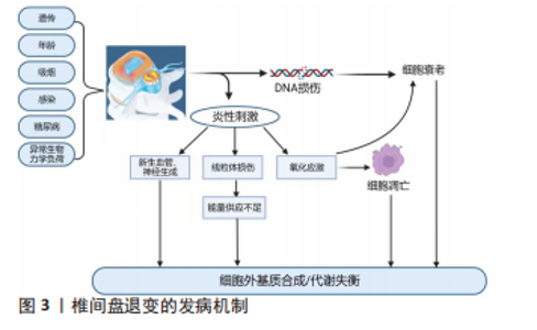 2.1 椎间盘退变概述 2.1.1 正常椎间盘结构 椎间盘是连接邻近椎体的纤维软骨组织,它通过脊柱传递由体质量和肌肉活动引起的轴向负荷,并在一定程度上维持脊柱的屈曲、伸展、侧弯和旋转等功能[12]。椎间盘由中央的髓核组织、外层的纤维环及上下软骨终板三部分组成,健康成人椎间盘中不含神经和血管。髓核组织是最重要的功能单位,在维持椎间隙高度和缓冲脊柱轴向负荷中起到关键作用[13]。髓核组织由髓核细胞和细胞外基质组成,髓核细胞负责维持细胞稳态[14],可以合成并分泌蛋白聚糖、Ⅱ型胶原等细胞外基质成分,其中Aggrecan是髓核细胞分泌最丰富的蛋白聚糖,可与透明质酸结合、聚集形成多聚体,富含带有负电荷的硫酸化基团侧链,通过调节渗透压来维持水合作用,保持髓核组织的亲水性,对脊柱承受的轴向负荷起缓冲作用。纤维环组织是由15-25个同心层组成的层状结构,可以划分为外层纤维环和内层纤维环,每层包含平行排列的Ⅰ型胶原纤维和Ⅱ型胶原纤维[15],此外弹性蛋白纤维在胶原纤维之间创建了一个跨层桥接网络,具有强大的弹性和可膨胀性,在脊柱负荷期间抵抗椎间盘的横向扩张并维持完整的结构[16]。软骨终板位于椎体和椎间盘之间,约为0.6 mm厚,结构类似于透明关节软骨,能够通过毛细血管的弥散功能将营养物质运输至椎间盘内,维持了椎间盘内的正常代谢[17]。 2.1.2 椎间盘退变发病机制 椎间盘退变是由椎间盘生理结构变化引起的,随着年龄的增长持续进展。据报道,椎间盘退变的病因可能与遗传易感性、糖尿病、年龄、吸烟、感染、异常的生物力学负荷相关[18],在影像学上表现为T2加权MRI上髓核组织的含水量减少,由高亮信号影转变为低信号黑影。根据影像学表现的不同,先后有学者依据髓核组织的信号强度、髓核组织与纤维环组织的界限及椎间隙高度分别提出了Pfirrmann分级和改良的Pfirrmann分级[19-20],用来指示椎间盘退变的发展与变化。 目前多数学者认为,椎间盘退变发生的病理生理学机制可能与多种致病因素导致的细胞外基质合成/分解代谢失衡有关,见图3,过度的机械负荷使DNA损伤,促进细胞衰老,导致转化生长因子β、胰岛素样生长因子等合成代谢因子的分泌减少,抑制了细胞外基质的合成[21],髓核细胞、纤维环细胞及免疫细胞(如巨噬细胞、T细胞、嗜中性粒细胞等)产生炎症因子,如肿瘤坏死因子α、白细胞介素1α/β、白细胞介素6、白细胞介素17、白细胞介素8、白细胞介素2、白细胞介素4、白细胞介素10、干扰素γ和各种趋化因子[22],这些炎症因子的激活诱导线粒体损伤,导致椎间盘组织能量供应不足[23],同时促进细胞外基质分解酶的合成,如基质金属蛋白酶和聚蛋白多糖酶,促进了细胞外基质的降解,引起细胞外基质代谢的不平衡[24]。此外,过度的机械负荷和炎性刺激还会诱导氧化应激,产生大量活性氧,进一步加速细胞衰老并诱导细胞凋亡[25-26]。因椎间盘组织存在于无血管、高渗、缺氧的微环境中,产生的细胞废物无法得到彻底处理,这些刺激的积累使椎间盘微环境稳态进一步失调,还会损伤组织的自我更新能力,加速椎间盘退变的进展,形成恶性循环[27]。当椎间盘组织的结构发生严重改变时,椎间隙高度大量丢失,椎间盘失去其生物力学功能,纤维环组织开始出现裂隙,大量炎症因子聚集,促进脑源性神经营养因子、神经生长因子及血管内皮生长因子生成[28],诱导椎间盘组织中新生血管形成和神经生长,这些炎性刺激的增加与神经血管生长引起的痛觉过敏导致了椎间盘源性疼痛。当纤维环组织的完整性被破坏,在长期椎间盘退变的条件下会引起椎间盘突出症、椎管狭窄症,从而出现神经压迫的症状如疼痛、麻木、无力等。"