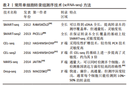 2.2.2 mRNA反转录及cDNA扩增 根据细胞类型的不同,单个细胞的RNA含量仅为1-50 pg[37],但高通量测序所需要的DNA样品量为200 ng以上,无法满足测序的要求,因此要将mRNA反转录为cDNA后进行扩增。在cDNA 扩增过程中,为避免不等比例扩增造成的测序结果偏倚,特异性分子标签(unique molecular identifiers,UMI)被当前大部分scRNA-seq技术所应用,每个UMI分别代表一个单独的转录本,使每个细胞和基因的转录本数量被量化,以校正偏倚,提高定量准确性[38]。目前常用的单细胞转录组扩增方法有模板转换法扩增技术(SMART-seq/SMART-seq2)、体外线性扩增技术(CEL-seq/CEL-seq2)、大规模平行扩增技术(MARS-seq)、微流体技术(Drop-seq),见表2。"