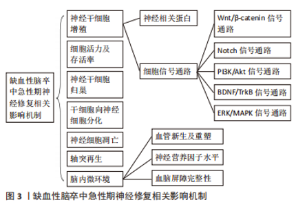 黄芪甲苷:SUN等[71]发现,中药黄芪有效活性成分黄芪甲苷能够上调β-catenin蛋白表达,增加Wnt2、GSK-3β含量,激活Wnt/β-catenin信号通路,激活中风小鼠海马体中的静止干细胞来促进中风后同侧海马的神经发生。SUN等[72]研究证实经黄芪甲苷处理后,脑卒中小鼠缺血皮质中p-PI3K和p-Akt的表达明显上调,促进神经细胞的增殖再生。NI等[73]发现,黄芪甲苷能够增强MCAO大鼠体内BDNF及TrkB表达水平,促进其体内神经干细胞增殖与神经发生。CHEN等[74]研究表明,黄芪甲苷VI能够磷酸化表皮生长因子受体和MAPK,促进短暂性脑缺血大鼠海马齿状回区、齿状回的颗粒下区内源性神经发生和神经干细胞增殖,且黄芪甲苷VI能够增强体外培养的神经干细胞自我更新和增殖。 阿魏酸钠和正丁苯酞:ZHAO等[75]研究发现,当归提取物阿魏酸钠和正丁苯酞联合脂肪源性干细胞治疗能够多途径促进缺血性脑卒中急性期神经修复:①能够激活光化学诱导血栓性脑卒中大鼠脑内Notch1通路,促进局灶性缺血后的脑室下区神经发生;②显著增加梗死区毛细血管密度及周长,且VEGF的表达比单独脂肪源性干细胞治疗高2.3倍,表明当归提取物阿魏酸钠和正丁苯酞联合脂肪源性干细胞治疗具有协同增强新生血管的作用;③能够进一步增强脂肪源性干细胞脑内移植的功效,使得浸润到缺血性脑卒中大鼠脑梗死区的移植细胞数量最大化;④显著增加脑卒中模型大鼠脑内调节血脑屏障通透性的关键整合蛋白claudin-5蛋白,保持内皮紧密连接,明显减少血脑屏障渗漏;而单纯脂肪源性干细胞治疗则有增加血脑屏障渗漏趋势,二者联合治疗,既明显改善局部脑血流量,也并未加剧血脑屏障渗漏。 红景天苷:LI等[76]发现,中药红景天提取物红景天苷能够增加MCAO大鼠脑组织内成纤维细胞生长因子2表达,通过其介导的cAMP/PKA/CREB通路促进树突和突触的可塑性。 人参皂苷:NI等[77]证实,中药人参有效成分人参皂苷能够抑制缺血条件下活性氧过度产生,保护线粒体完整性,促进缺血性脑卒中小鼠脑内神经元存活。LI等[78]发现,人参皂苷能够下调缺血性脑卒中大鼠促凋亡蛋白Caspase-3表达,抑制缺血性脑卒中急性期神经细胞凋亡,促进神经细胞存活。 五味子苷A:ZONG等[79]证实,中药五味子有效提取物五味子苷A治疗后缺血性脑损伤小鼠缺血区Nestin水平明显提高,梗死周围区域成熟神经元和未成熟神经细胞的数量显著增加,有效促进缺血性损伤后内源性神经干细胞增殖和神经元分化;并且五味子苷A能够上调缺血性脑损伤小鼠体内Cdc42-GTP的活性,促进神经祖细胞的细胞周期和细胞骨架重排,参与神经元轴突的生长并介导f-肌动蛋白的神经纤维骨架的形成,最终促进轴突和新神经纤维进入半暗带。 三七叶三萜:XIE等[80]发现,中药三七有效活性成分三七叶三萜通过作用于NAMPT-NAD+通路及其下游关键的SIRT1/2/3-Foxo3a-MnSOD/PGC-1α信号通路,显著保持氧化还原平衡,抑制过量活性氧水平,减轻线粒体损伤,显著提高缺血缺氧条件下神经元的存活率。 丹参素钠:研究证实,中药丹参提取物丹参素钠治疗:①能够显著增加缺血性脑卒中动物脑内DCX蛋白含量,增加梗死周围区域成熟神经元数量,促进神经干细胞增殖及神经发生;②能够增强局灶性脑缺血小鼠脑内SDF-1的表达,促进脑缺血后神经干细胞的归巢;③能够显著上调缺血性脑卒中急性期VEGF表达,增加梗死灶周围新生微血管数量,促进血管神经修复[81]。 丹酚酸A:研究发现,中药丹参有效成分丹酚酸A能够显著增加脑缺血再灌注大鼠脑内Nestin表达,促进神经再生,且丹酚酸A能够上调Wnt3a抑制GSK3β活性,从而增加β-catenin的积累,促进缺血性脑卒中模型大鼠内源性神经发生[82]。 丹参酮IIA:WANG等[83]证实,中药丹参活性成分丹参酮IIA治疗能够明显降低局灶性脑缺血大鼠脑内Nogo-A、RhoA和ROCKII表达,促进轴突再生可能,发挥神经保护作用。 三七皂苷R1:ZHU等[84]研究发现,中药三七提取物三七皂苷R1:①能够显著增加脑缺血再灌注大鼠脑内Nestin和DCX表达,增加梗死周围区域成熟神经元数量,促进神经干细胞增殖及神经发生;②能够显著上调MCAO大鼠BDNF、p-TrkB、p-Akt和环磷腺苷效应元件结合蛋白(cAMP-response element binding protein,p-CREB)表达,发挥神经保护及促神经元作用;③能够上调脑缺血再灌注损伤大鼠脑内髓鞘碱性蛋白(myelin basic protein,MBP)、突触素PSD95和神经递质SYN表达,促进轴突再生和树突重塑;④能够显著增加MCAO大鼠脑内BDNF、神经生长因子和神经营养因子4表达,促进神经发生及神经细胞存活。 银杏内酯B:YANG等[85]研究发现,中药银杏叶提取物银杏内酯B治疗能够显著上调MCAO大鼠脑内抗凋亡因子Bcl-2表达,下调Bax表达,增加Bcl-2/Bax比率,抑制神经细胞凋亡。 川芎嗪:LIN等[86]发现,川芎嗪联合骨髓间充质干细胞显著上调缺血性脑卒中大鼠脑内缺血性脑SDF-1和CXCR4的表达,缺血半暗带骨髓间充质干细胞数量明显增加,促进骨髓间充质干细胞向缺血区域的归巢;川芎嗪联合干细胞治疗能够刺激缺血性脑卒中大鼠脑组织缺血区域BDNF的分泌,使得BDNF表达水平显著升高;川芎嗪联合骨髓间充质干细胞治疗后,缺血性脑卒中大鼠脑内新生神经元数目、DCX数目、星形胶质细胞数量和微血管密度均显著增加,可协同促进缺血性脑卒中后的血管新生和神经新生。 川芎酯:WU等[87]证实,中药川芎活性成分川芎酯能够显著增加缺血性脑卒中大鼠基质金属蛋白酶和ATP产生,降低活性氧的产生,促进