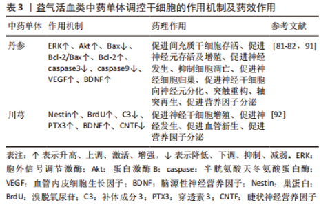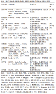 麝香酮:ZHOU等[88]研究发现,中药麝香提取物麝香酮能够呈剂量依赖性增强缺血性脑卒中大鼠体内Akt表达,神经细胞数目明显增加,显著提高细胞活力。麝香酮治疗后,MCAO大鼠缺血区Nestin水平明显提高,梗死周围区域成熟神经元和未成熟神经细胞的数量显著增加[89]。 α-细辛酮:LEE等[90]发现,石菖蒲提取物α-细辛酮能够提高缺血性脑卒中小鼠体内β-catenin蛋白和cyclinD1蛋白含量,增强pERK因子表达,促进小鼠内源性神经干细胞增殖分化;经石菖蒲提取物α-细辛酮处理后,缺血性脑卒中小鼠脑内神经元细胞数目明显增多,并且新生神经细胞成熟率是其他细胞的5.93倍,是星形胶质细胞的2.45倍,即α-细辛酮显著增强神经元样细胞的分化,限制星形胶质细胞样分化。 2.2.2 益气活血开窍类中药单体 (1)益气活血类中药单体:见表3。"